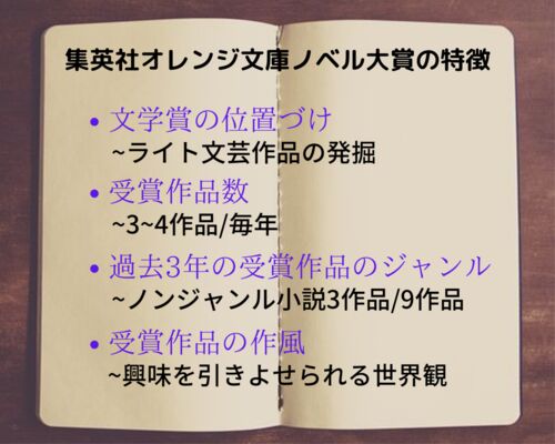 集英社オレンジ文庫 ノベル大賞のお話 読書の豆知識 ノンジャンル小説を募集する新人文学賞特集、第2回はライト文芸を発掘する集英社オレンジ文庫ノベル大賞を取り上げてみました。過去3年間の受賞作品と、三浦しをんさんをはじめとした選考委員の書評をもと…