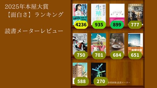 2025年本屋大賞作品の読書メーターレビュー数順「面白さ」ランキング 本屋大賞2025の読書メーターレビュー数 本屋大賞の発表が待ち遠しい時期ですよね。 4月9日の発表を前に、恒例の受賞予想をさせていただきますね。 まずは、読書メーターのレビュー数別に…