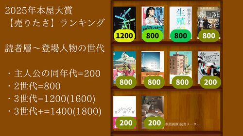 2025年本屋大賞ノミネート10作品の登場人物の年齢層別「売りたさ」ランキング 2025本屋大賞 登場人物の世代構成 昨年に続き、2025年本屋大賞予想を当てたい読書家の花水由宇(hanami yu)は今年も「面白さ」「売りたさ」「おすすめ」別にノミネート作品を分…