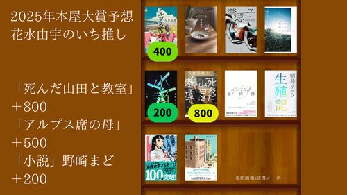 本屋大賞の二次投票のようにノミネート作品にポイントをつける 本好きの私たちにとって、今年の本選びで盛り上がる読書の一大イベント本屋大賞。 本屋大賞の投票には参加できませんが、1人の本好きとして2025年本屋大賞ノミネート作品のベスト3を発表させて…