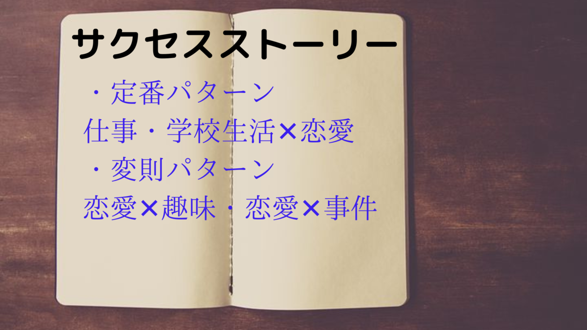 反対に、恋愛✕趣味・恋愛✕事件のように一見関係なさそうな出来事が思いもよらないストーリーの流れになる「変則パターン」もリアルな舞台設定を感じられるサクセスストーリーではないでしょうか。